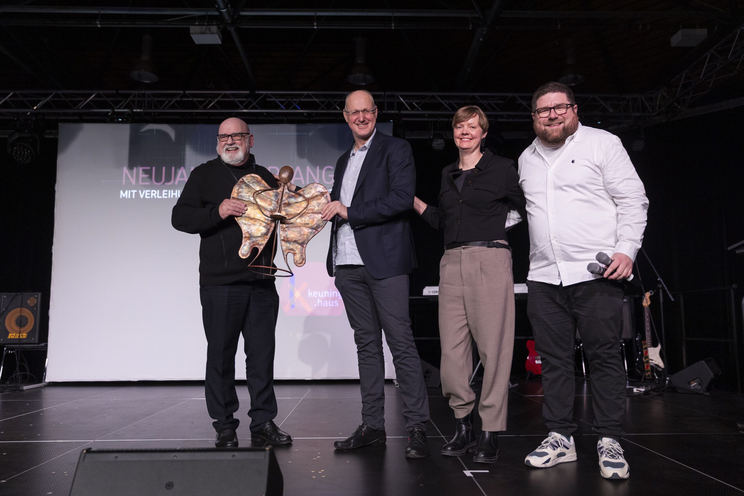 Die drei „Engel der Nordstadt“ für 2025 sind beim Neujahrsempfang des Dietrich-Keuning-Hauses am Samstag, 31. Januar, ausgezeichnet worden: Die Kana Suppenküche, die Jugendverkehrsschule im Fredenbaum und die Straßenfußballliga Nordstadtliga nahmen den Ehrenamtspreis für ihren unermüdlichen ehrenamtlichen Einsatz entgegen. Bezirksbürgermeisterin Hannah Rosenbaum, Kerstin Furkert, stellvertretende Leiterin des Amts für Stadterneuerung, und die Stiftungsmanagerin der BVB-Stiftung „leuchte auf“, Maike Vollmer, überreichten die kunstvollen Engel-Skulpturen im feierlichen Rahmen. Anlässlich des 20-jährigen Bestehens der Engel-Verleihung bedankte sich das Quartiersmanagement Nordstadt außerdem beim Initiator und engagierten Unterstützer des Ehrenamtspreises, Christian Schmitt. Als Anerkennung überreichte das Team dem Geschäftsführer des Wohnungsunternehmens Julius Ewald Schmitt stellvertretend für den Stadtteil ein kleines Dankeschön.